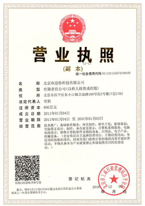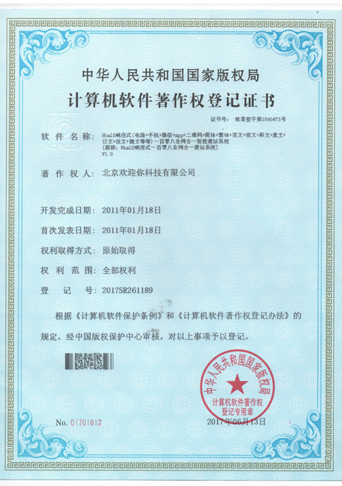 北京歡迎你科技有限公司獲得多項版權(quán)局"計算機軟件著作權(quán)登記證書",并已獲得“全國誠信經(jīng)營示范單位”、“全國質(zhì)量服務客戶滿意誠信企業(yè)”和“全國重合同守信用品牌企業(yè)”等榮譽稱號。